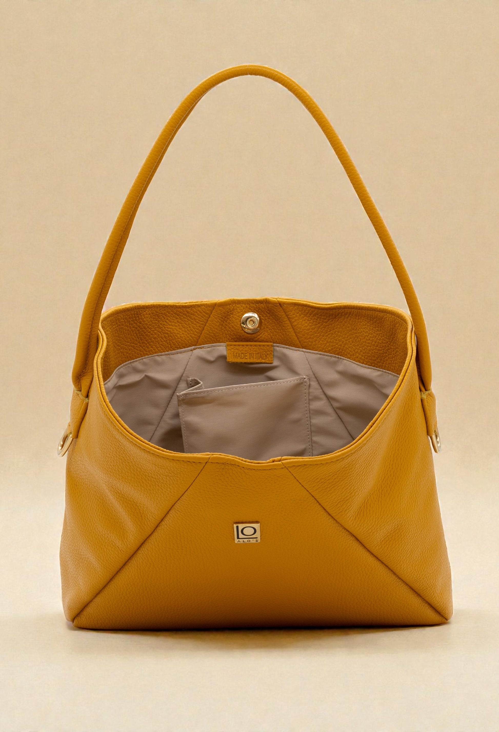 Entirely leather handle with the option of adding a practical shoulder strap thanks to the side rings also designed to personalize the bag with cute "charms".