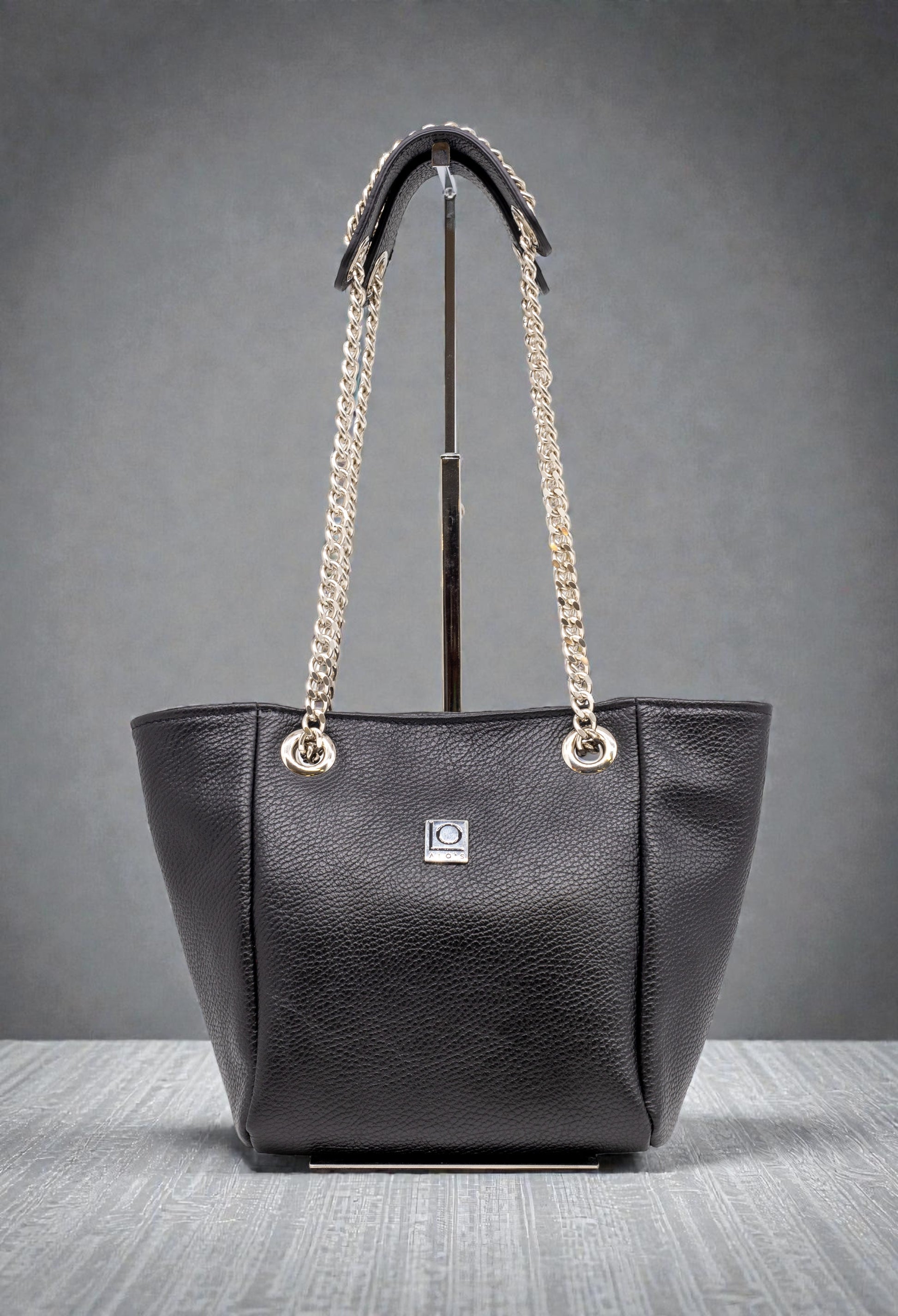 The raw cut leather handle with the passage of the chain rests on the shoulder like a jewel that lights up the face