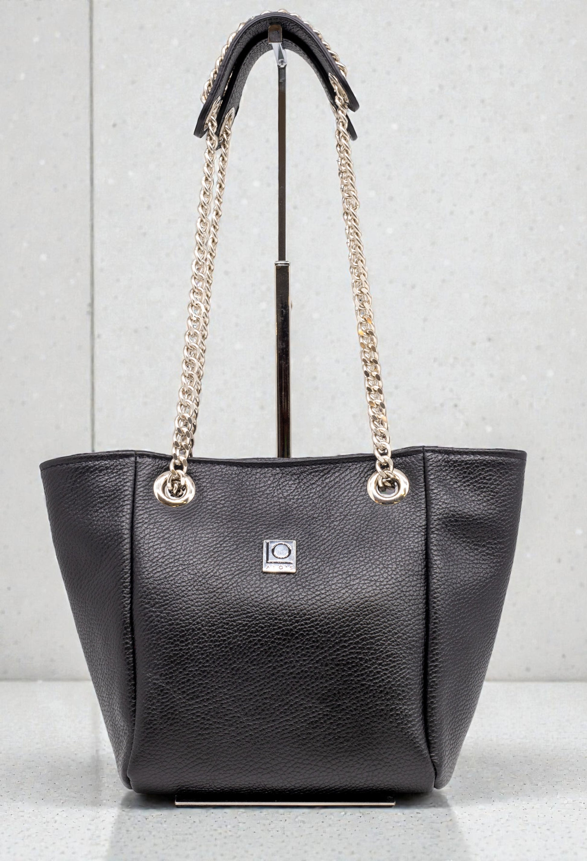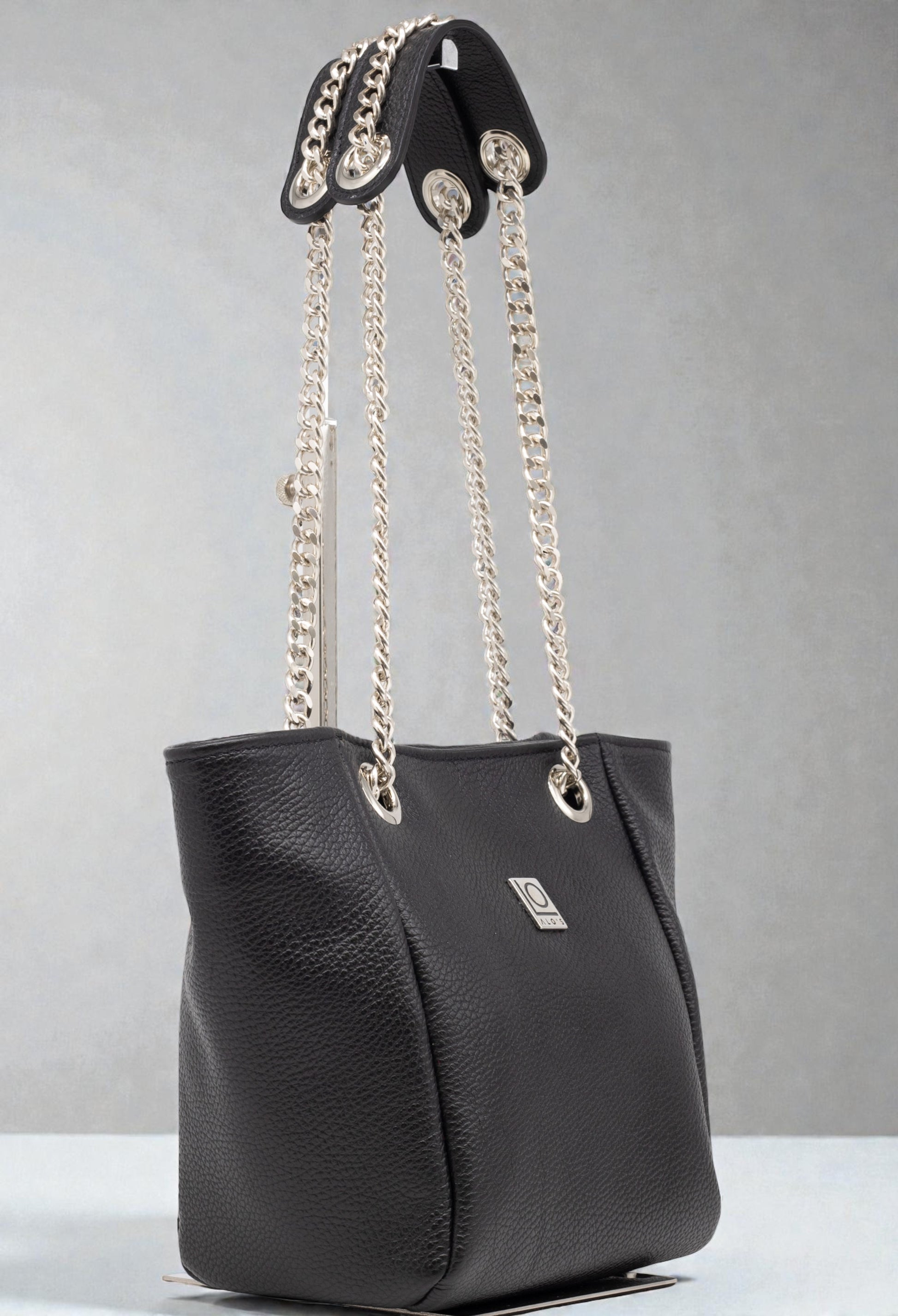 The raw cut leather handle with the passage of the chain rests on the shoulder like a jewel that lights up the face