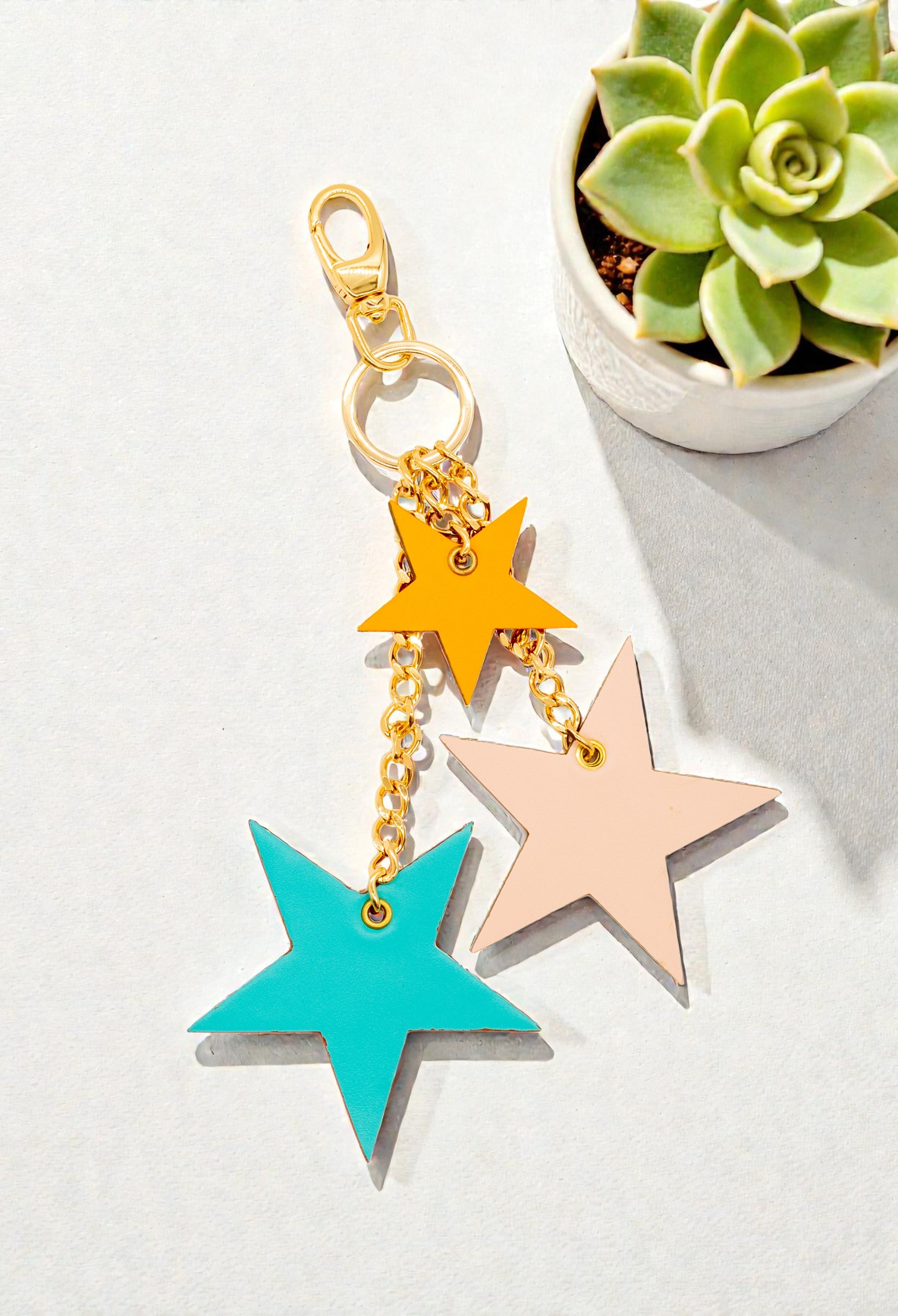 tre ciondoli misti, stelle e cuori, in vera pelle con bordi rifiniti in vernice stesa a mano